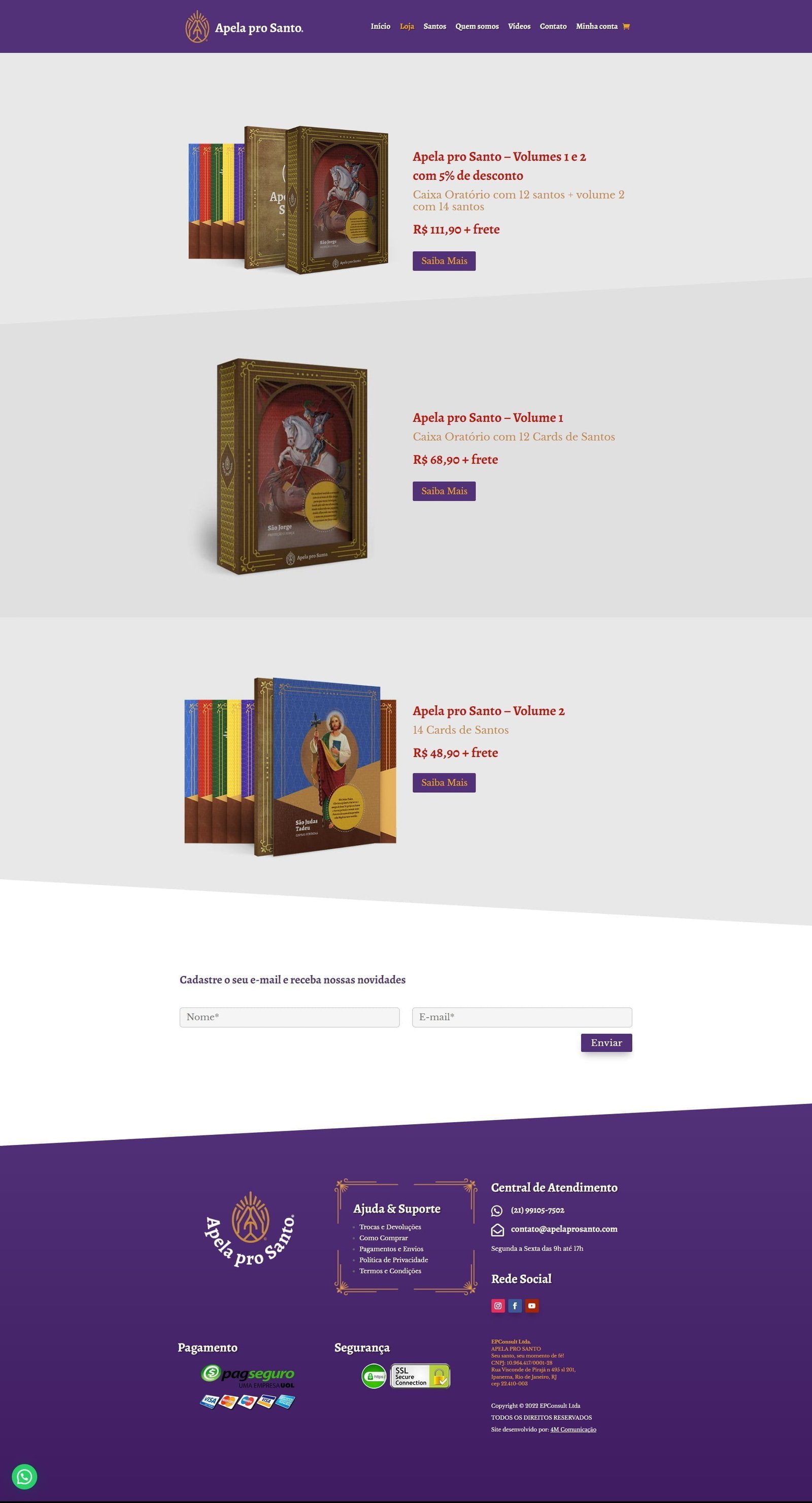 O site apelaprosanto.com é uma plataforma de e-commerce especializada na venda de produtos religiosos para o Brasil. A empresa foi fundada com o objetivo de fornecer uma ampla variedade de fichas de diversos santos como objetos de devoção.
