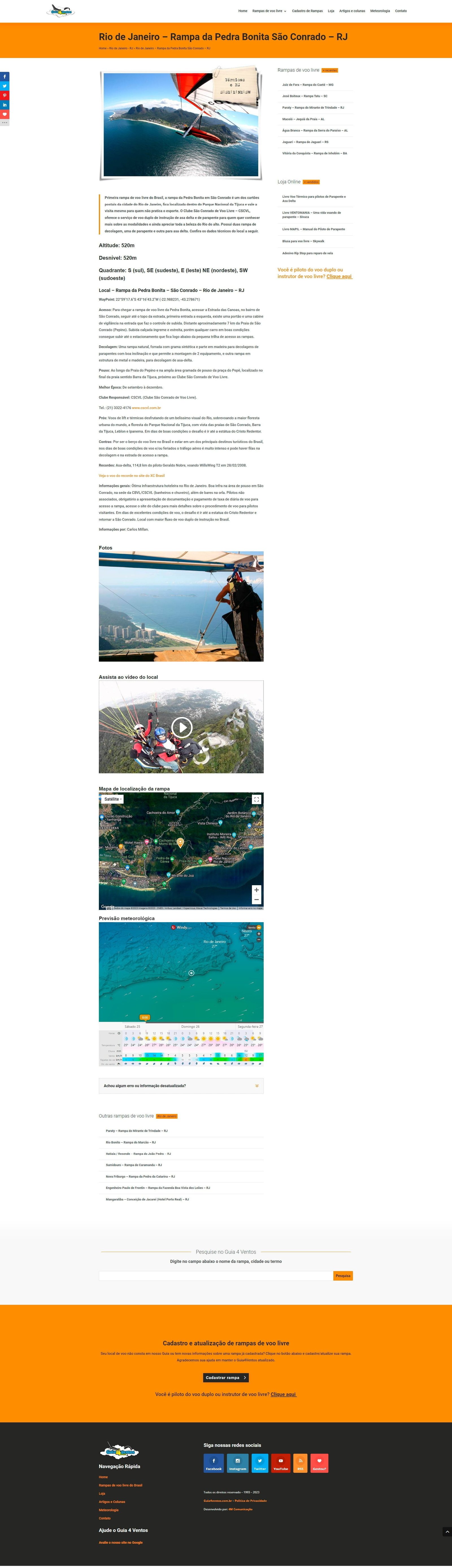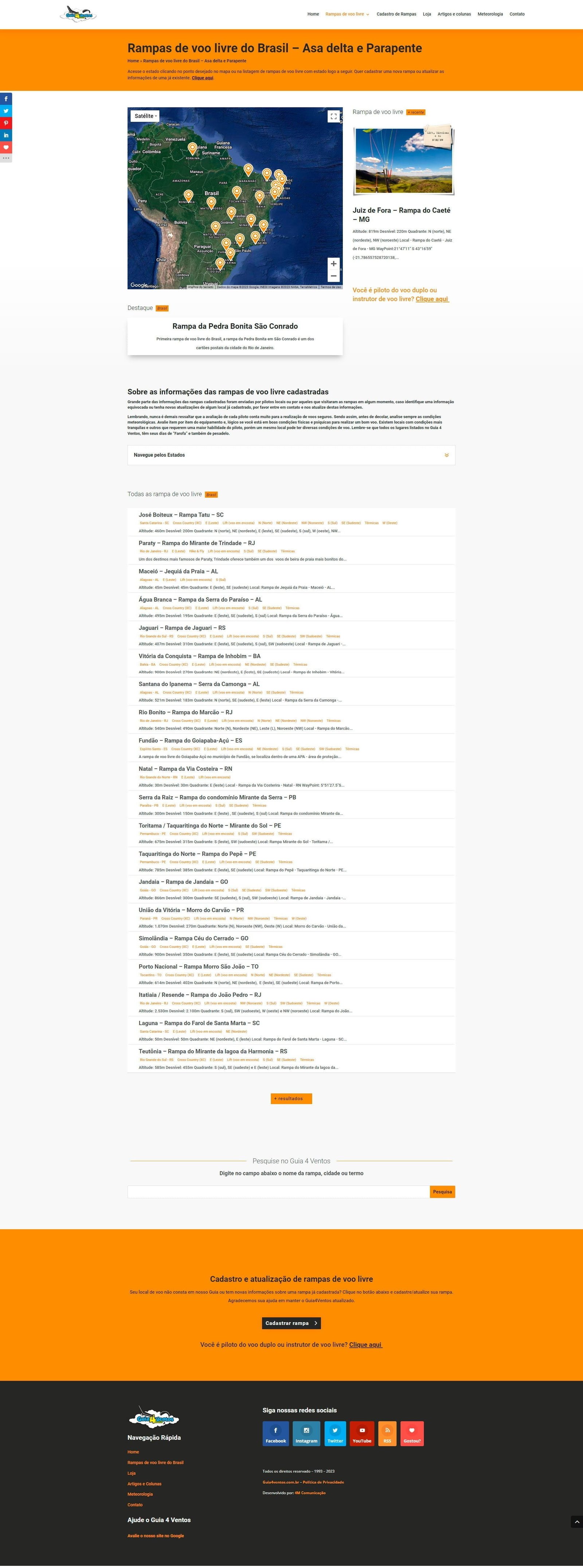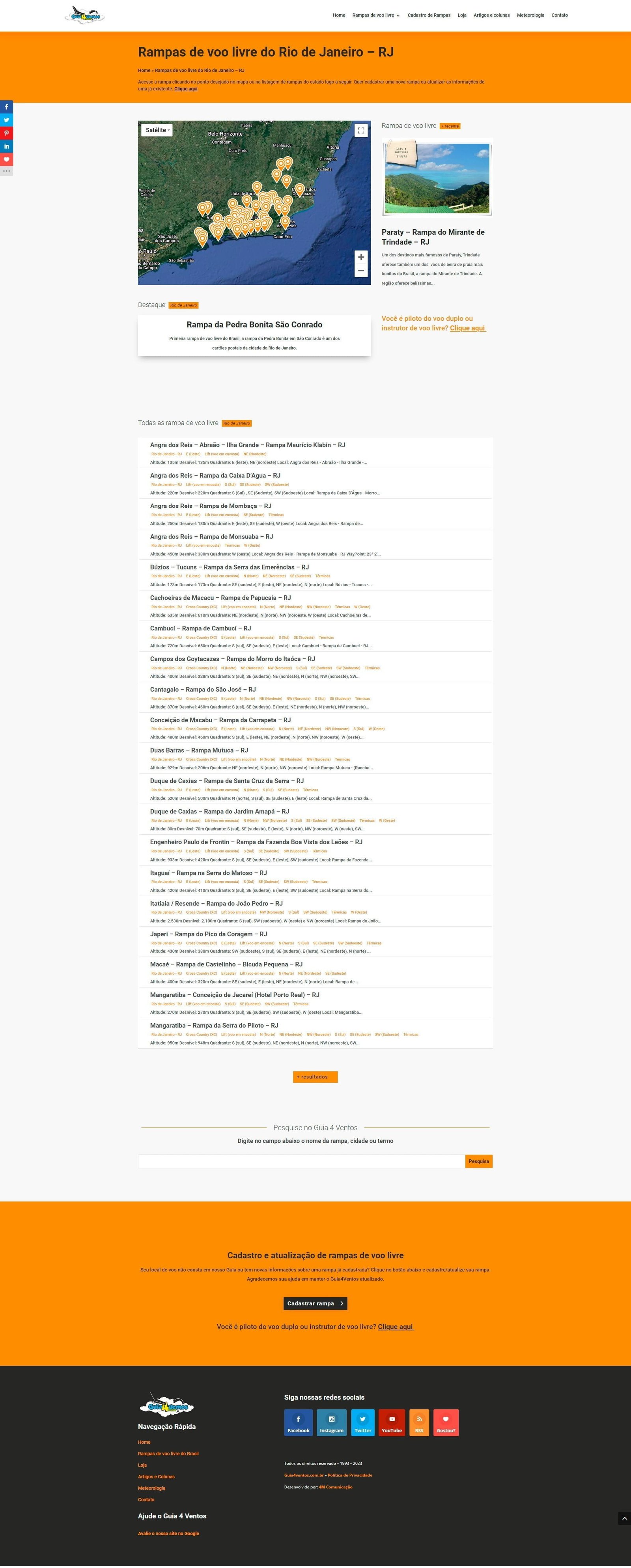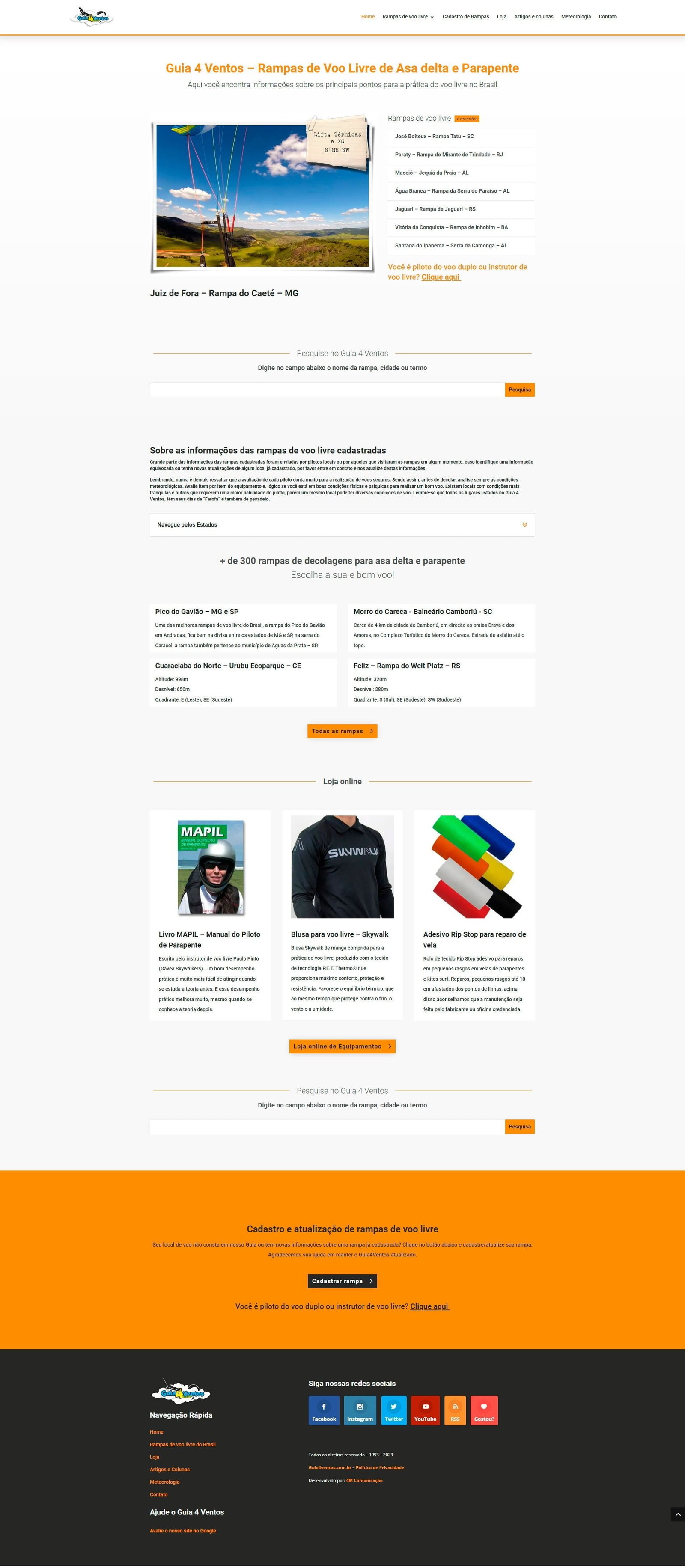 O Guia 4 Ventos é um site brasileiro que se dedica ao esporte de voo livre. Uma das principais características do site é o seu amplo cadastro de rampas de voo livre, que é considerado o maior do Brasil. Essa base de dados é atualizada constantemente pelos usuários do site, que contribuem com informações sobre as rampas e suas condições. Estamos sempre fazendo alguma atualização de layout ou de informação.